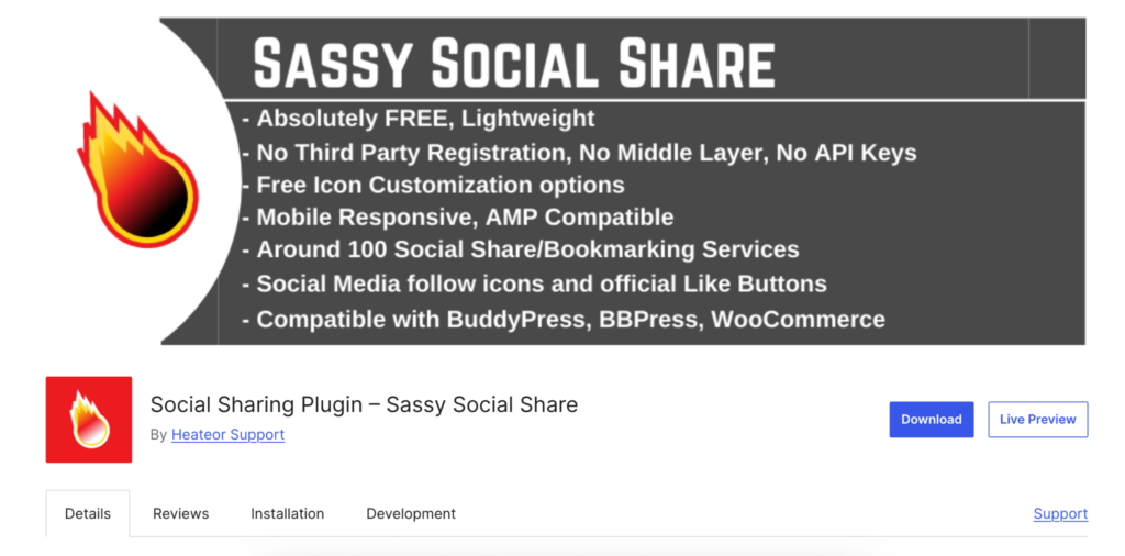 Sassy Social Share is a popular free plugin that offers a wide variety of button styles and placement options, making it great for users who want flexibility without spending money. It’s especially useful when you prefer plenty of styling choices while still keeping things simple and accessible.