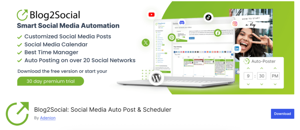 Blog2Social is a powerful WordPress plugin designed for users who want more control over their social media sharing. It allows per-post customization, letting you customize each post for different social networks, and includes a drag-and-drop calendar for scheduling content efficiently.