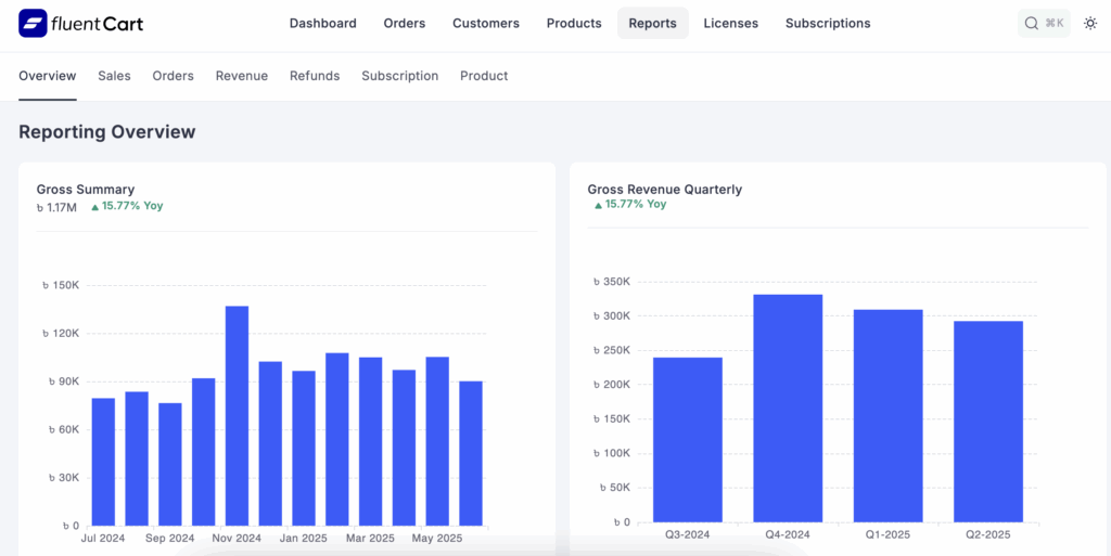 Data-driven decisions start here. FluentCart’s built-in analytics suite shows daily and total revenue, order volume, heatmaps of peak sales hours, and customer behavior insights. Track refunds, subscription performance, license usage, and UTM-tagged campaign success, all without needing external tools. The dashboard turns raw data into clear action steps.