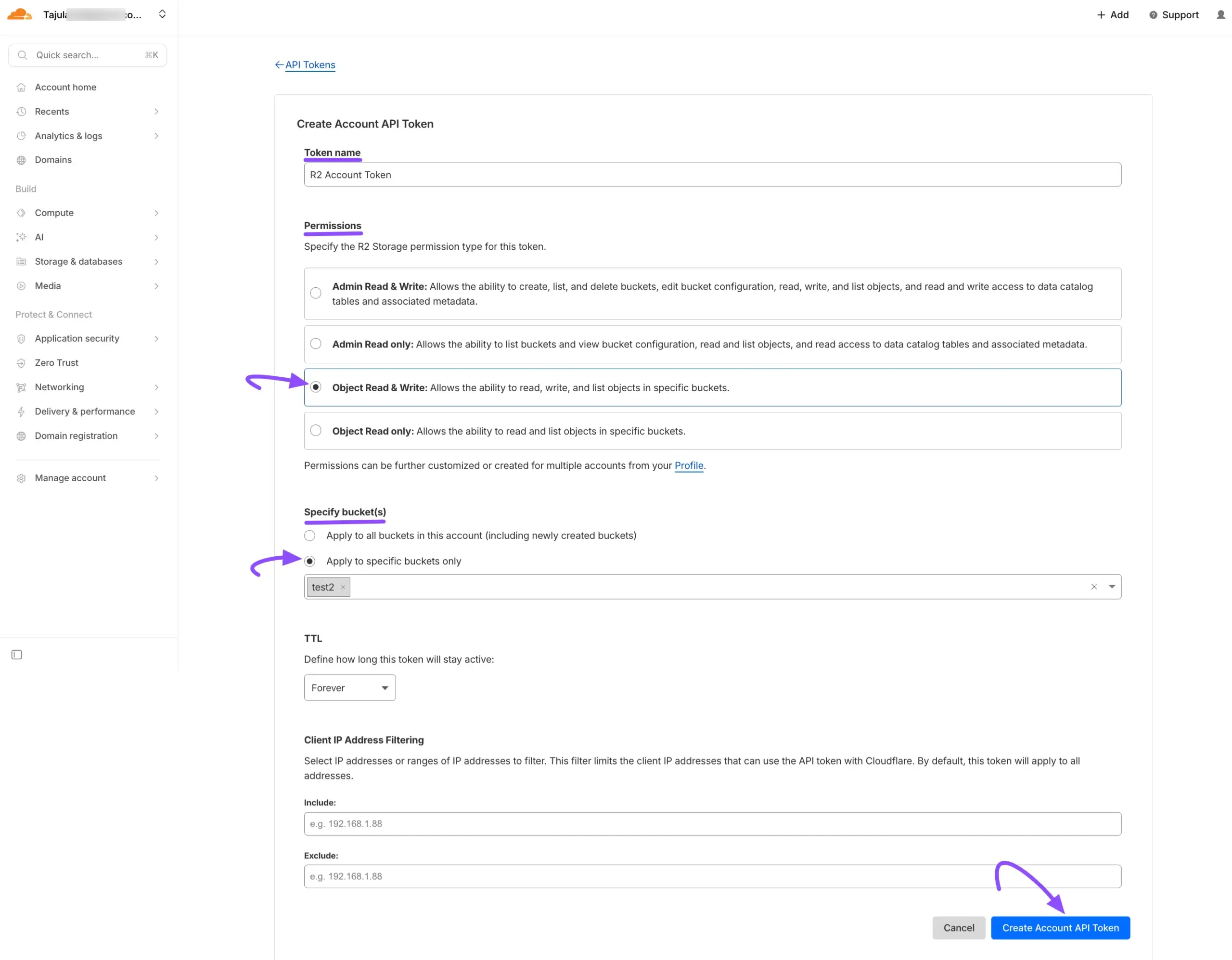 Next, choose the Bucket where you want to store your files from the dropdown menu. Adjust any other settings as needed, and then click the Create API Token button.