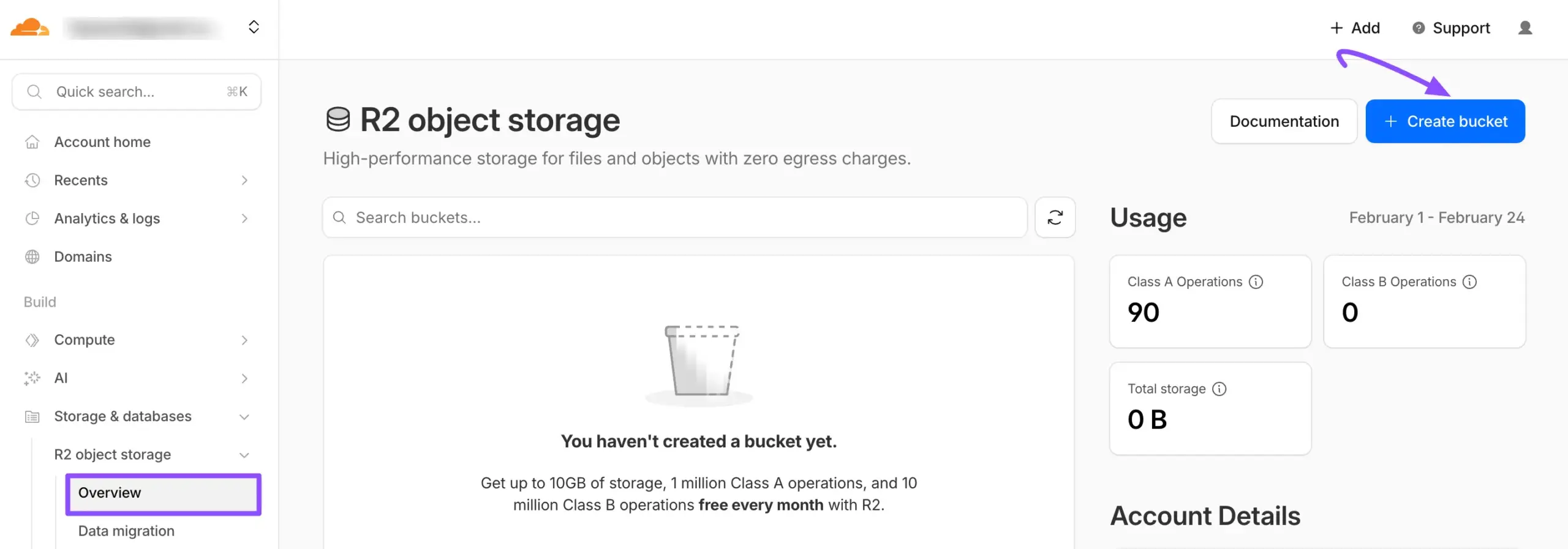 Navigate to R2 Object Storage from the left sidebar, find Overview under R2 Object Storage, and click on it. Now click on the Create Bucket button to create a bucket.