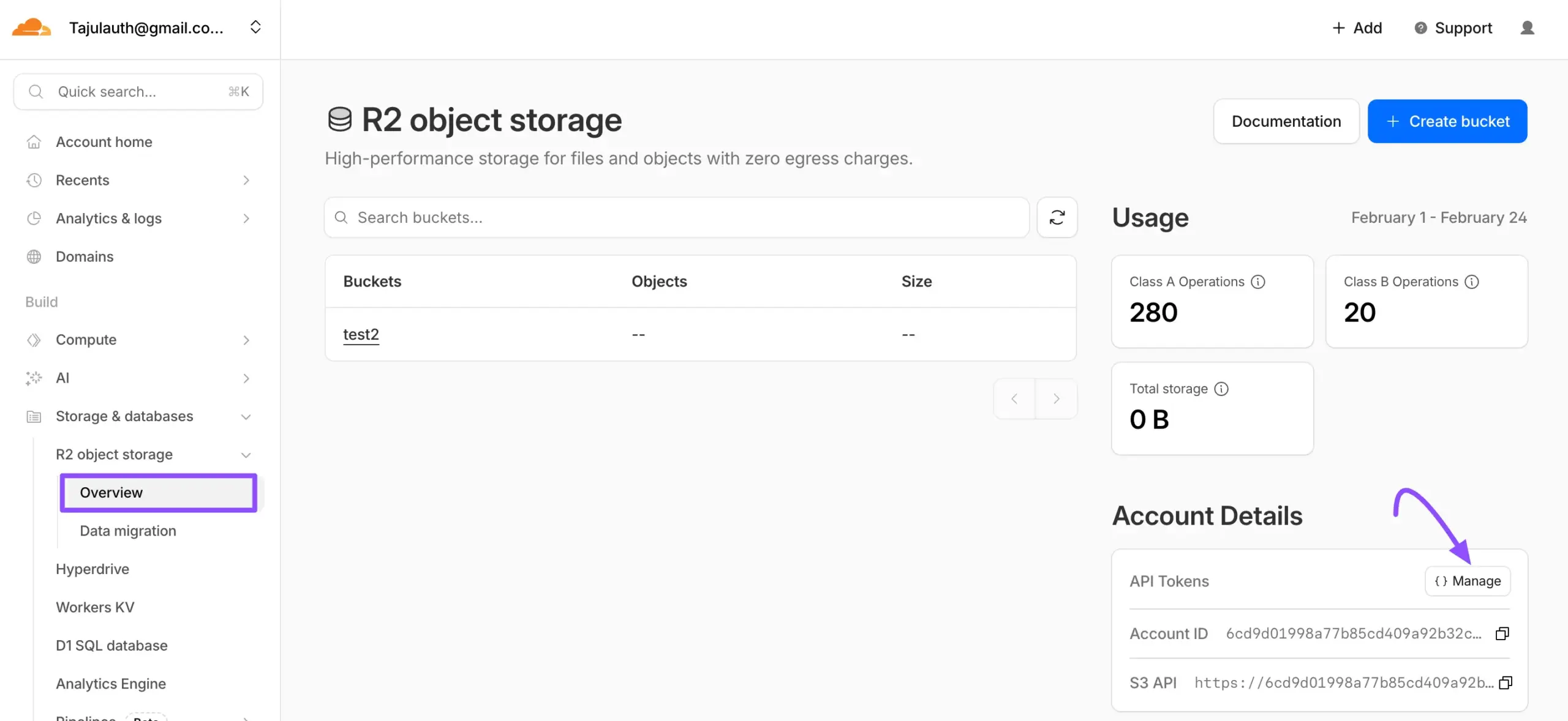 To create a Cloudflare Access Key go to your Cloudflare account dashboard again and click on the Manage R2 API Token.