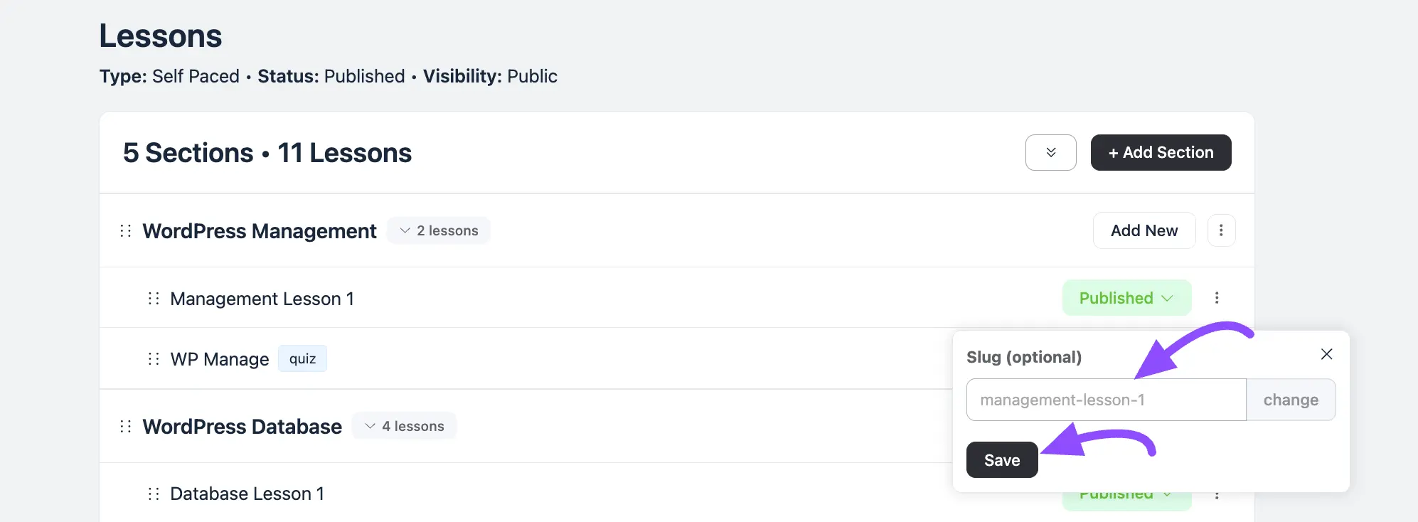 Edit Lesson Slug (optional): FluentCommunity enables you to edit the lesson slug directly from your course lesson easily. For this, click the three-dot menu button found on the right-hand side of the lesson row. From the dropdown options, select Edit Slug.