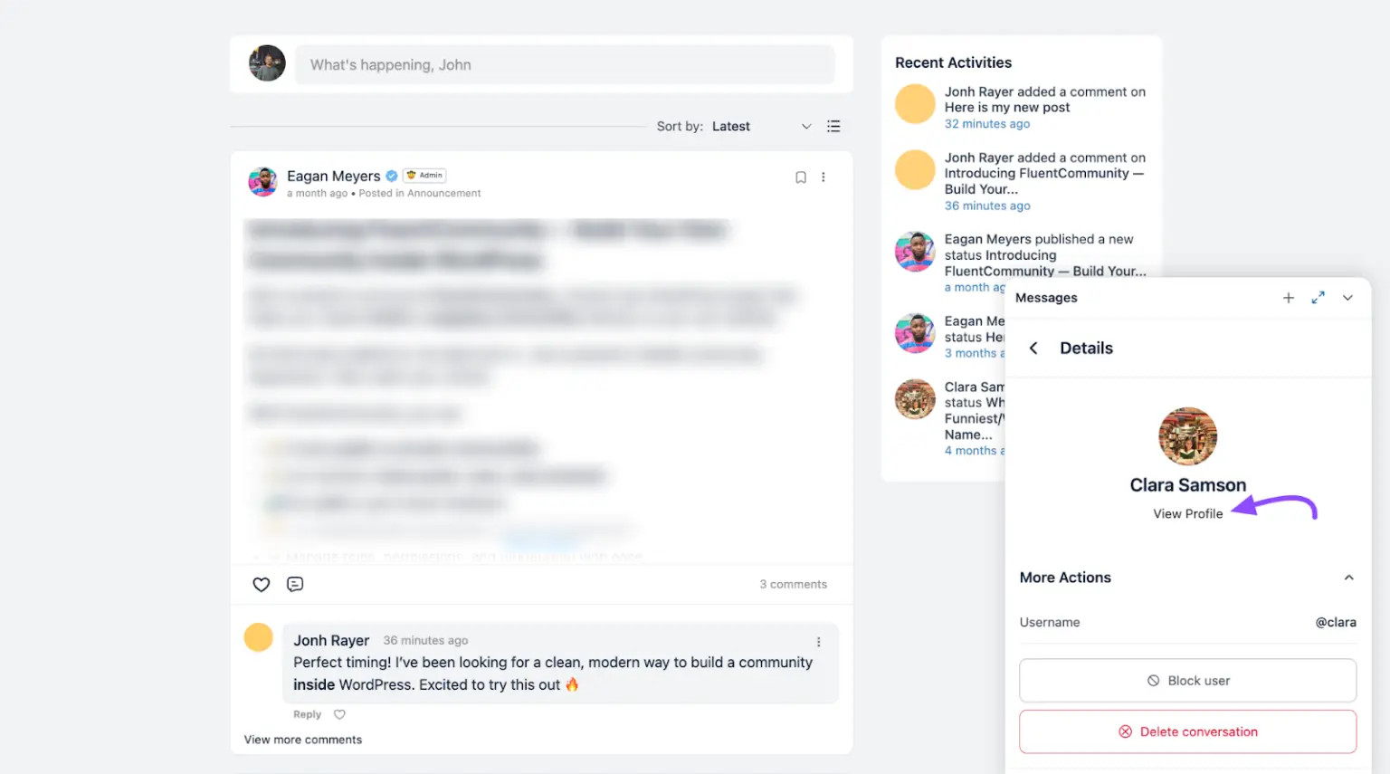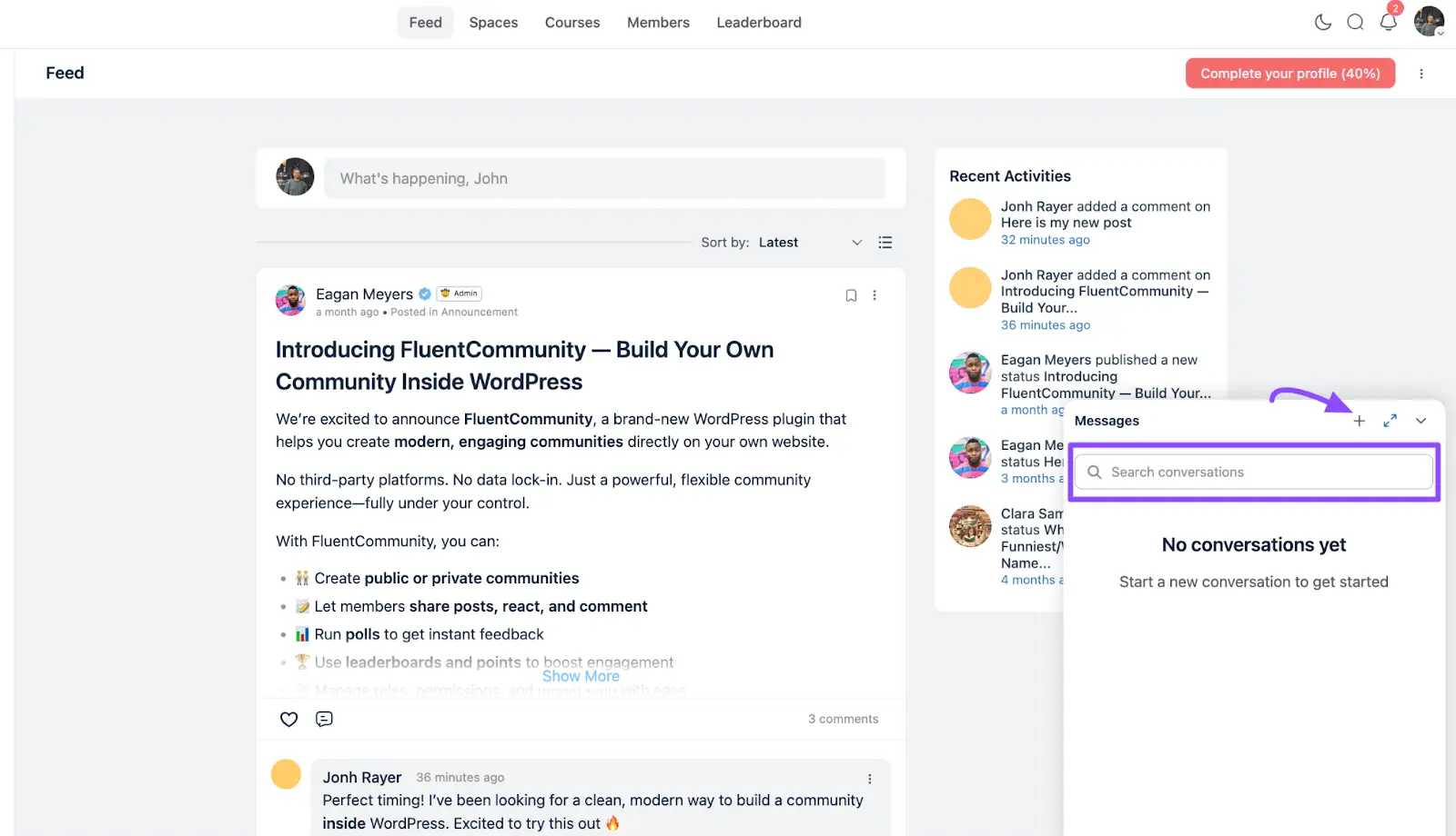 The Fluent Community Chat feature makes it easy for members to stay connected, share media, and view profile details, creating a vibrant community space for real-time communication.