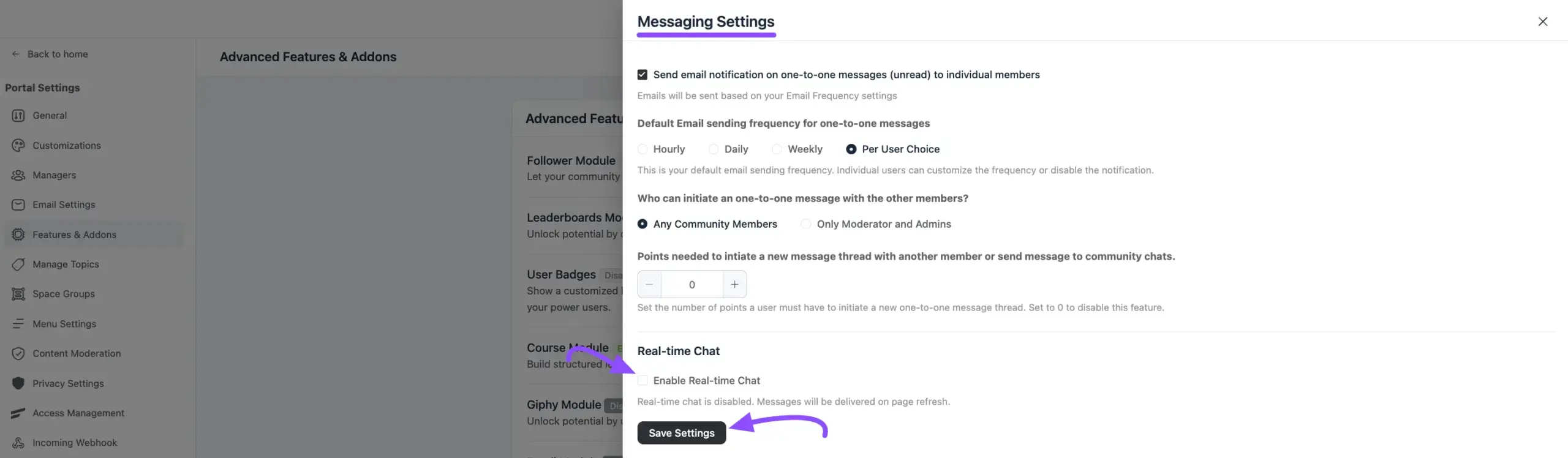 After enabling the chat, click on Messaging Settings to customize your message preferences with community members.