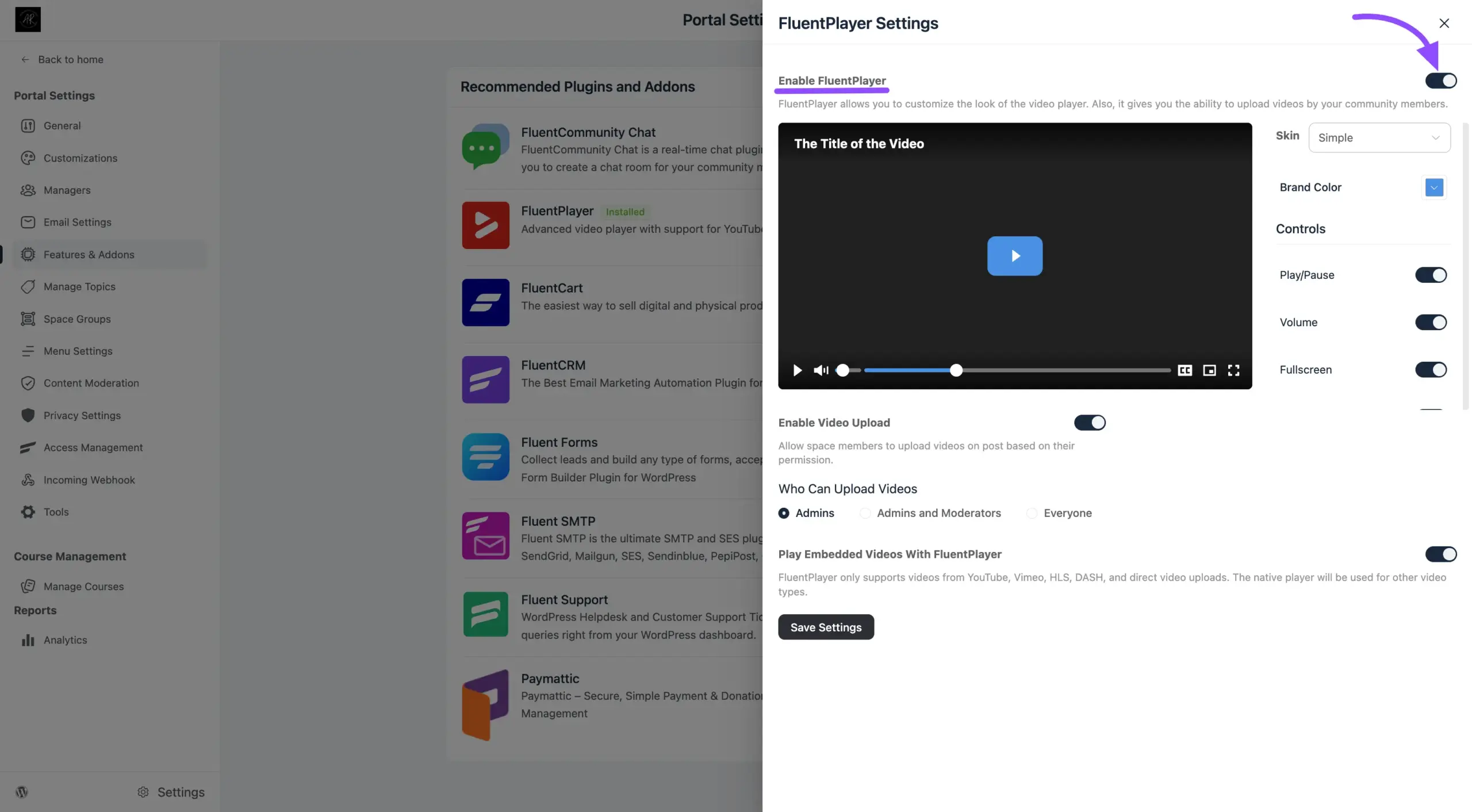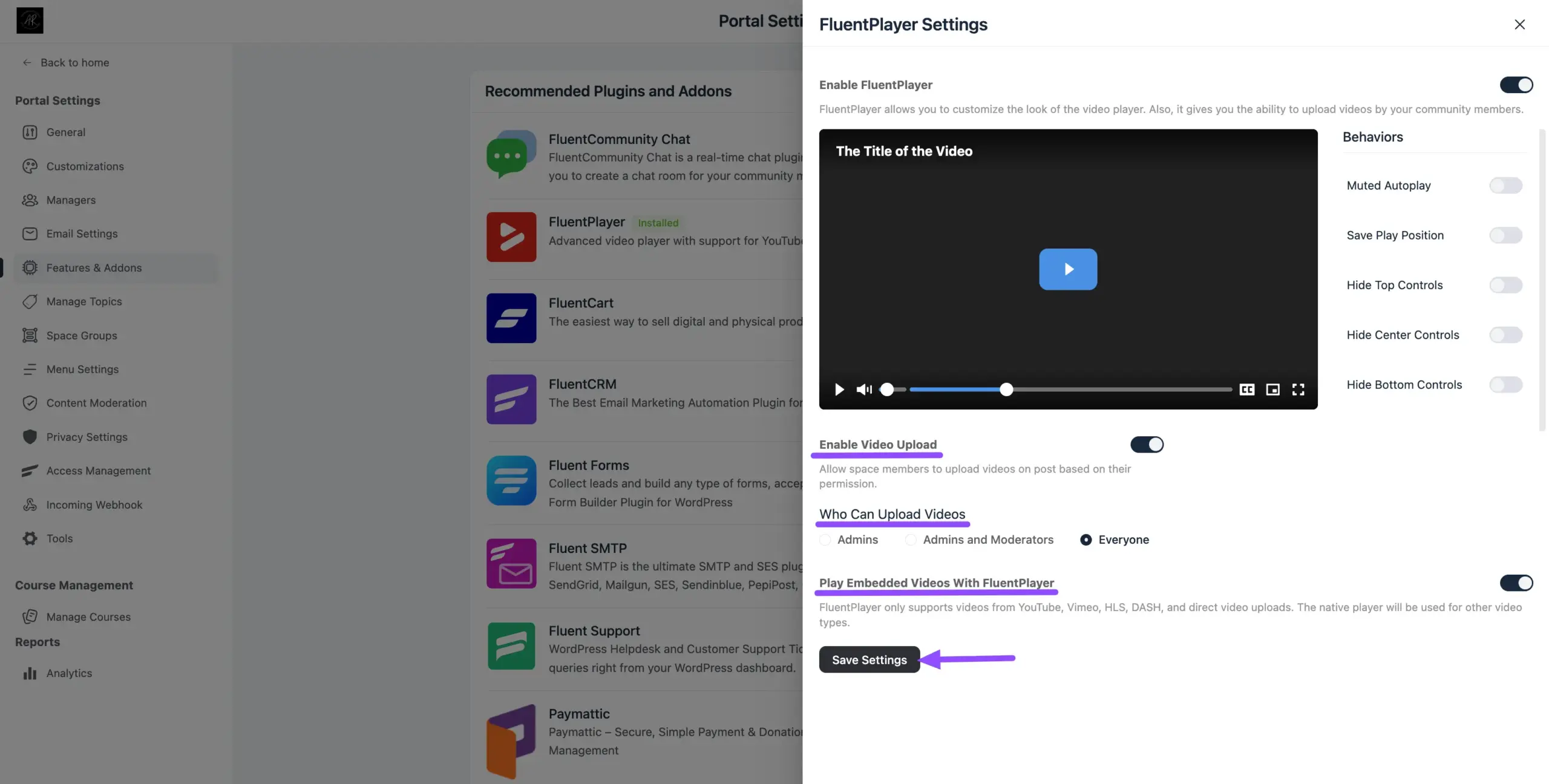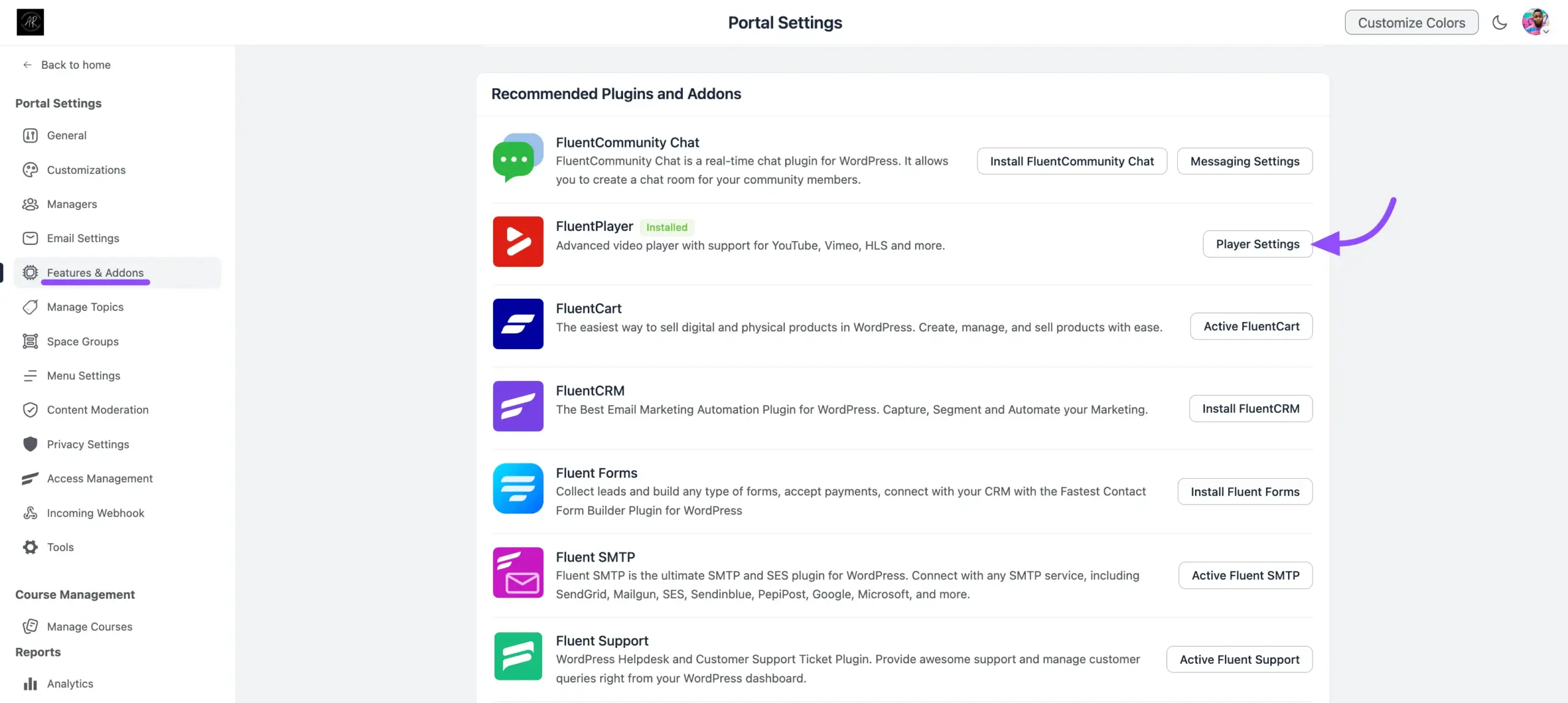 Note: If you do not have Fluent Player installed yet, you can easily install it directly from the community settings. Go to FluentCommunity > Settings > Features & Addons, find the Fluent Player module under Recommended Plugins, and click Install FluentPlayer.